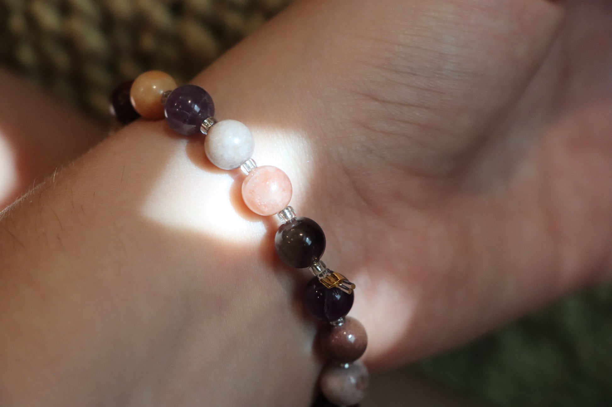 Crystal bracelet with beads, handmade by my mom. Charged on Persephone altar on top of a pomegranate offering, with support of my spirit team.