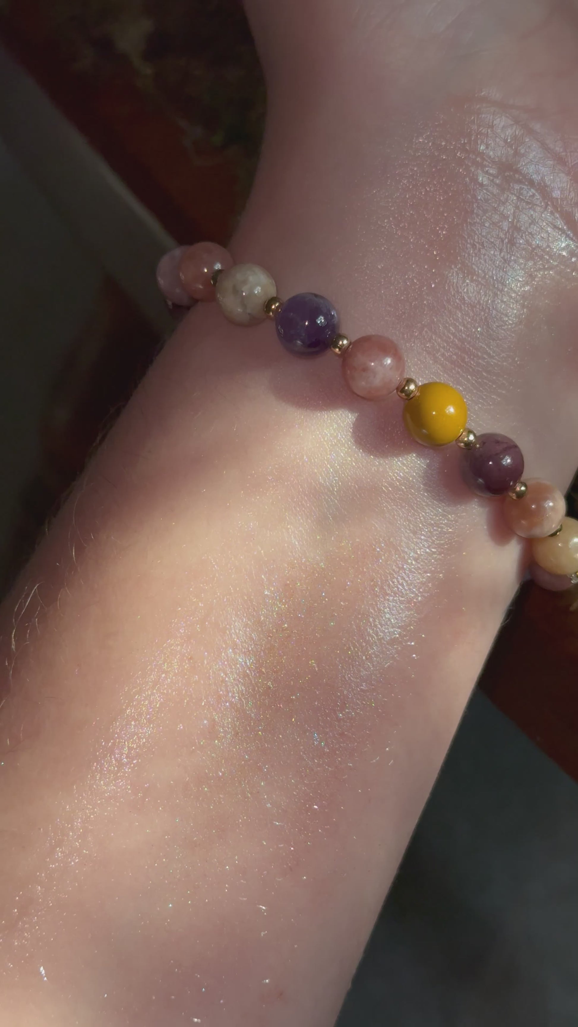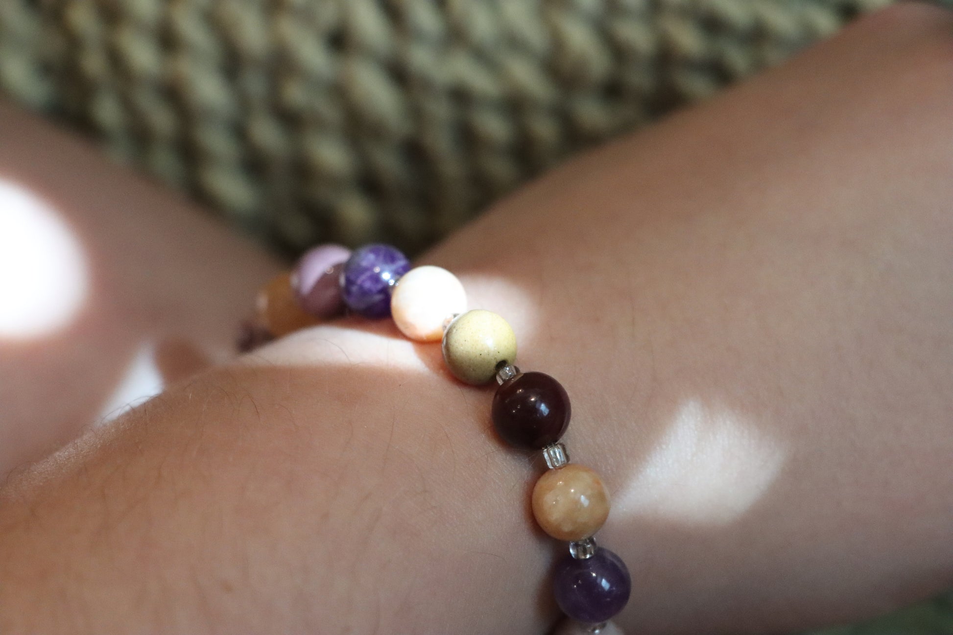 Bracelet contains Amethyst, Picture Jasper, Egg Yolk Stone, Yellow Jade, Mahogany Obsidian, and Sunstone Gem, Infused with the Energy of Persephone: